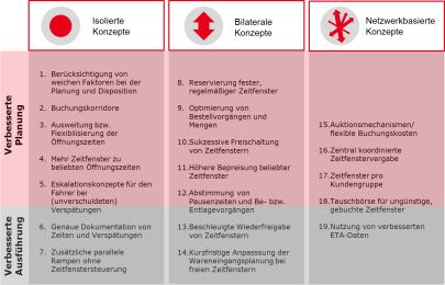 Basierend auf der Simulationsstudie sowie auf der Datenaufnahme in Workshops, Interviews und durch Fallstudien wurden zehn der 19 entwickelten Koordinationsmechanismen als besonders nutzbringend für kleine und mittlere Speditionsunternehmen identifiziert. Diese sind in der Tabelle grau hervorgehoben. Es zeigt sich, dass Mechanismen, wie das sukzessive Freischalten von Zeitfenstern oder die Ausweitung von Zeitfenstern zu beliebten Öffnungszeiten, zu einer Erhöhung der Flexibilität bei der Buchung beitragen können. Weitere Mechanismen, wie die Flexibilisierung der Wareneingangsplanung und die verbesserte Nutzung von ETA-Daten, setzen an einer Verbesserung der zeitfenstergesteuerten Anlieferung an. Gemein ist den Maßnahmen, dass sie eine Zunahme der Kommunikation und des Austauschs von Echtzeit-Daten zwischen Lagerhausbetreibern und Spediteuren erfordern.