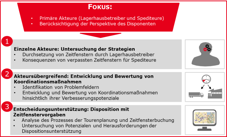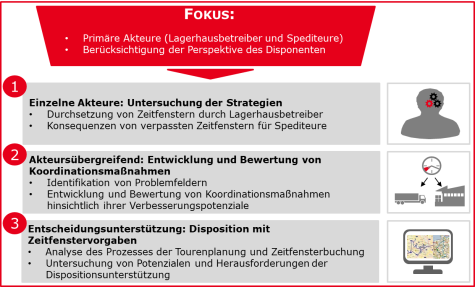Die Projektbearbeitung erfolgte in sieben Arbeitspaketen. Arbeitspaket 1 umfasste die Problembeschreibung und -abgrenzung. In Arbeitspaket 2 wurde bereits in einer frühen Phase der Projektbearbeitung ein grundlegendes Simulationsmodell entwickelt. Dieses wurde auf der Basis einer umfassenden Datenerhebung im Rahmen von Arbeitspaket 3 angepasst und weiterentwickelt. In Arbeitspaket 4 wurden realitätsnahe und repräsentative Szenarien definiert. Anhand dieser Szenarien wurden in Arbeitspaket 5 simulationsbasiert die Auswirkungen ausgewählter Verhaltensweisen von Lagerhausbetreibern und Koordinationsmechanismen zur verbesserten Nutzung von Zeitfenstermanagementsystemen (ZMS) untersucht. Eine Konzentration auf den Disponenten und dessen Verhaltensweisen erfolgte in Arbeitspaket 6, bevor in Arbeitspaket 7 die Dokumentation der Ergebnisse in Form eines Leitfadens vorgenommen wurde.